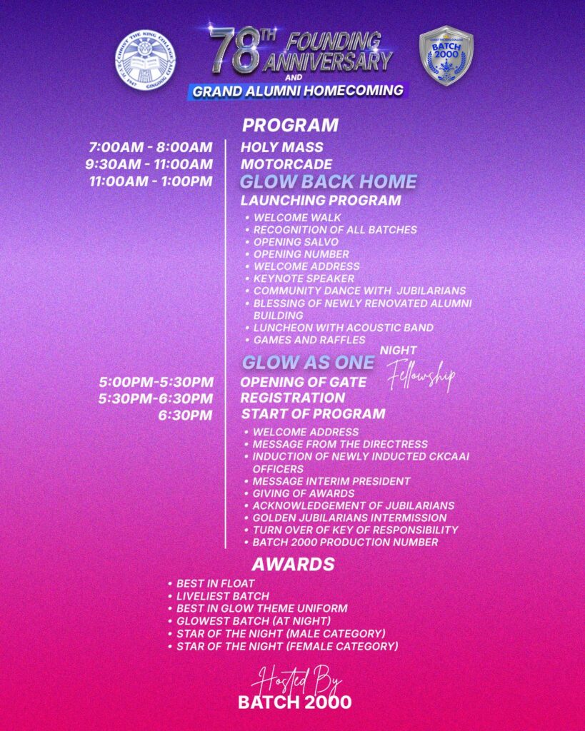 We’re delighted to confirm your registration for the 78th CKC Founding Anniversary and Grand Alumni Homecoming — a celebration of 78 years of Kingly excellence, unity, and shared memories under the theme “Glow as One, Shines together, through the years and beyond..”